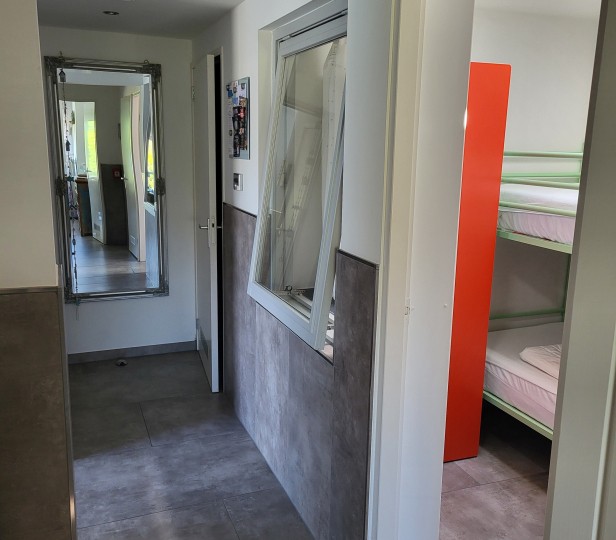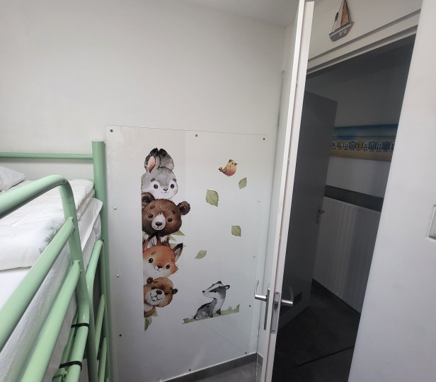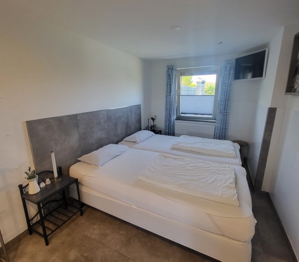 Ein großzügiges Elternschlafzimmer mit einem komfortablen Doppelbett (2 x 2 Meter), Fliegengitternetz, Fernseher und ein weiteres Schlafzimmer mit einem praktischen Kinderetagenbett.