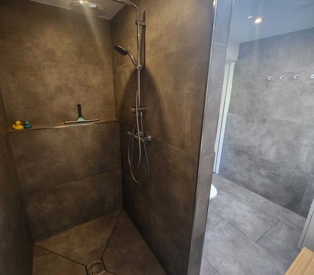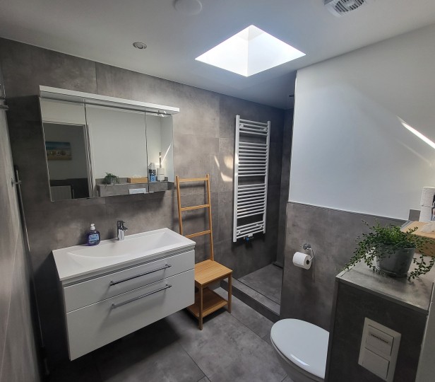 Badezimmer: Modernes Badezimmer mit begehbarer Regendusche. Eine Waschmaschine mit integriertem Trockner befindet sich im Abstellraum.