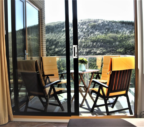 - Balkon mit Aussicht auf die Dünen und Dorfplatz