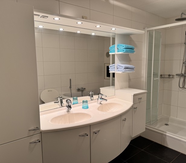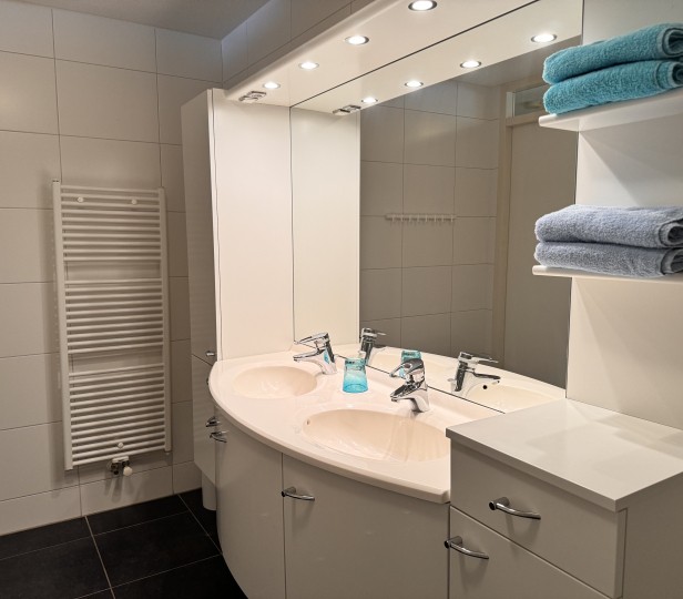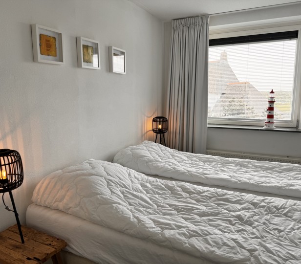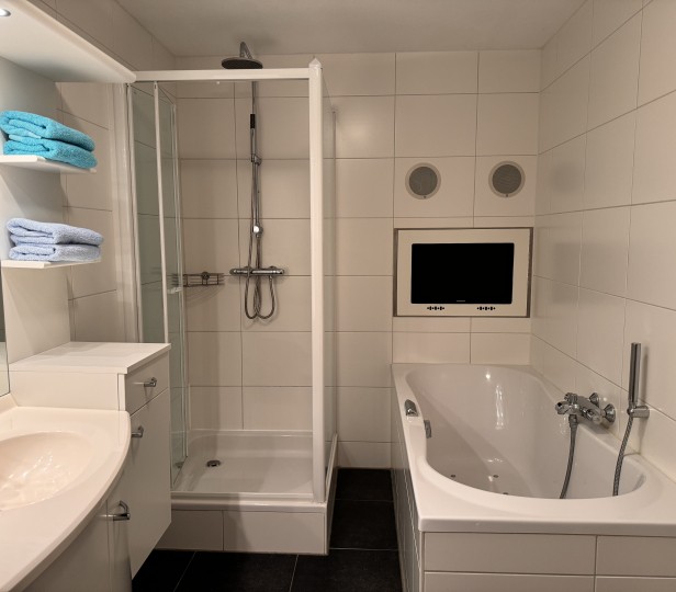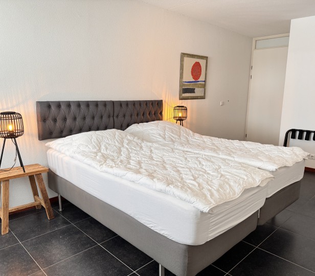 De twee slaapkamers zijn uitgerust met comfortabele 2x2 boxsprings van 90x200. De badkamer is compleet met een whirlpool ligbad, een separate douche en een dubbele wastafel. In de hal vind je een toilet en een opberg-/wasruimte.