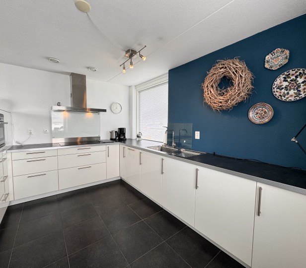 De woning heeft een unieke, maar sfeervolle inrichting. De half-open keuken is voorzien van vele gemakken en grenst aan de woonkamer en een gezellige eethoek. Hier is veel lichtinval en er zijn mooie uitzichten.